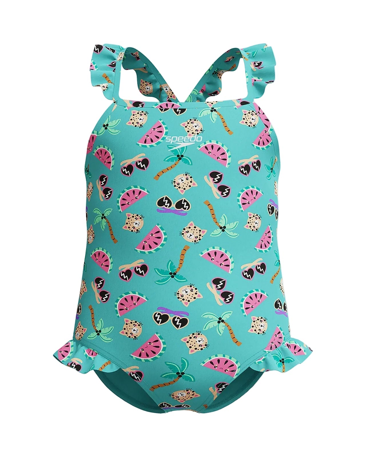 Our Thinstrap Crossback swimsuit has summer written all over it and includes a fun holiday-themed print. Young children will enjoy the frill detail and can move easily in the cross-back design with thin straps. Keep the fun going for longer with our EnduraBrite fabric, engineered with 4-way stretch and CREORA® HighClo™ for high chlorine resistance and superb shape retention. Body made of 82% Polyester, 18% Elastane (Creora® HighClo).