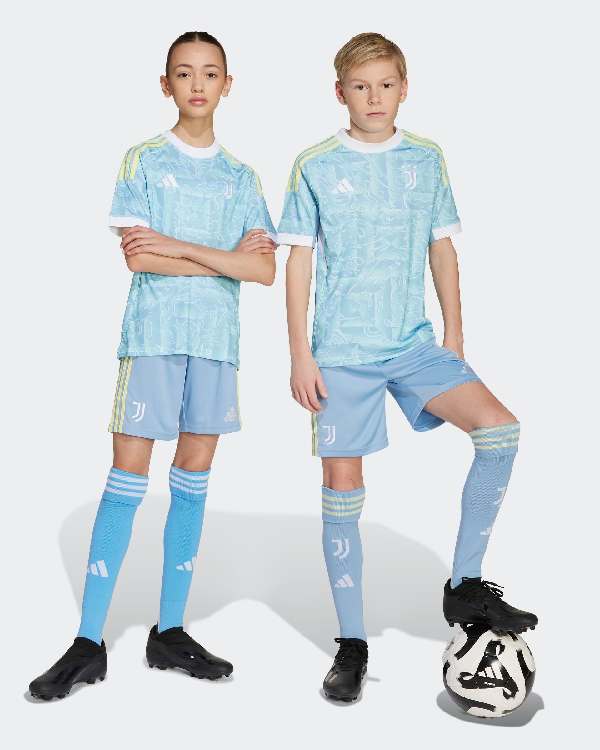 Carry those carefree summer vibes into a brand-new football season. Showing off blue pastel shades and flashes of yellow and white inspired by the Turin city flag, this juniors' adidas Juventus jersey is sure to make a splash on match days. Moisture-managing AEROREADY and embroidered details combine to deliver comfort and pride.