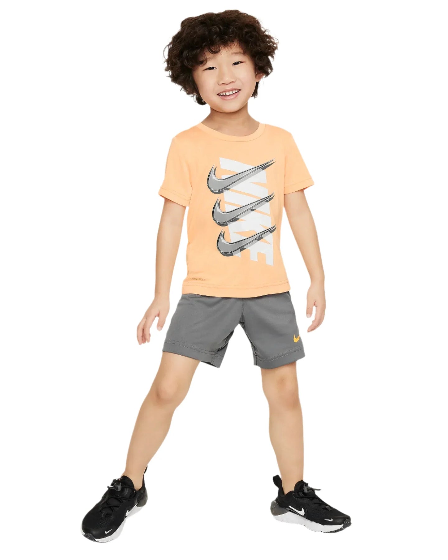 This 2-piece set is an easy way to get your child kitted out for play. Both pieces are made of knit fabric enhanced with quick-drying, moisture-wicking Dri-FIT technology to help little ones stay cool and dry while they move. The graphic tee has a tagless crewneck for easy wear and the matching shorts have a stretch waistband for a comfy fit. Let's go!