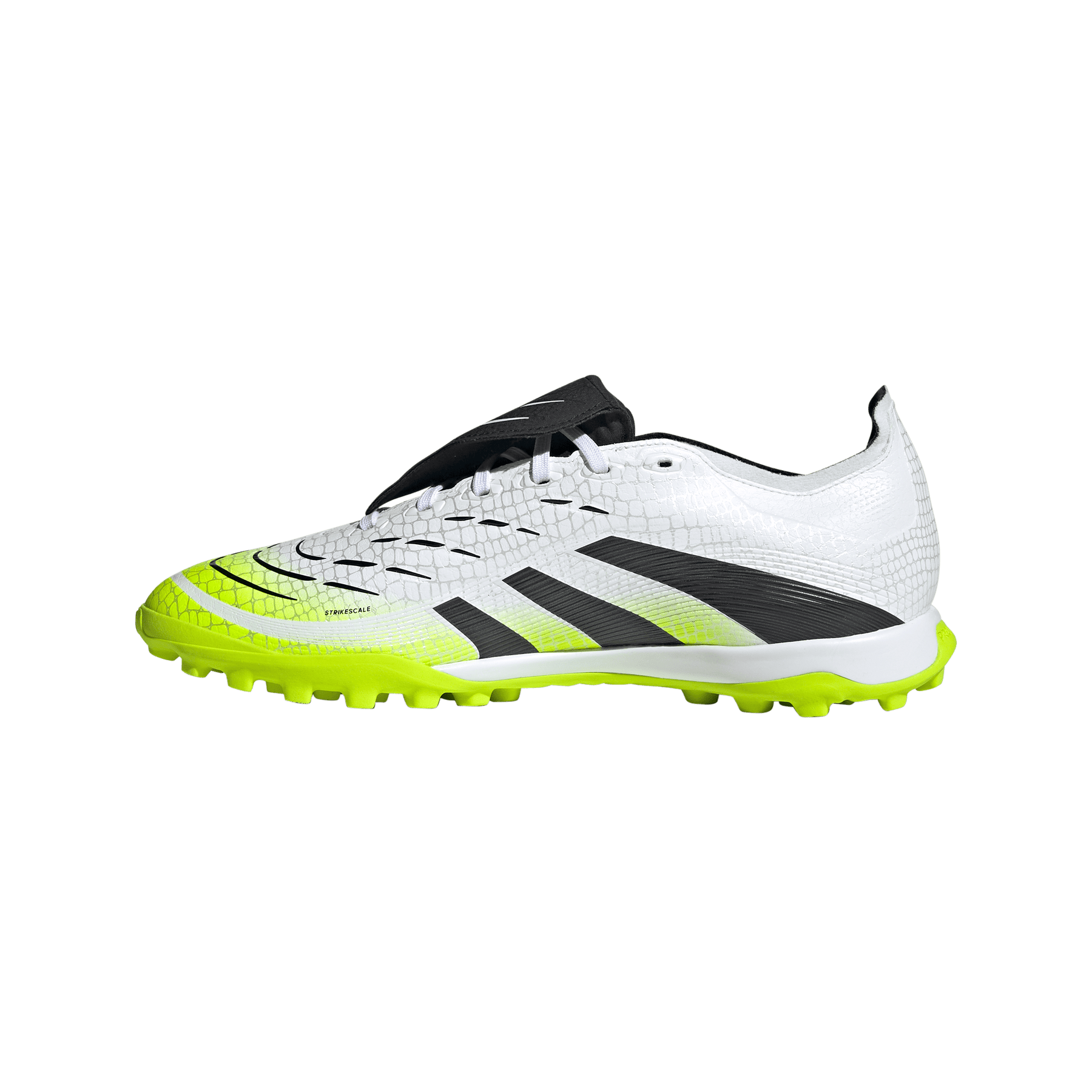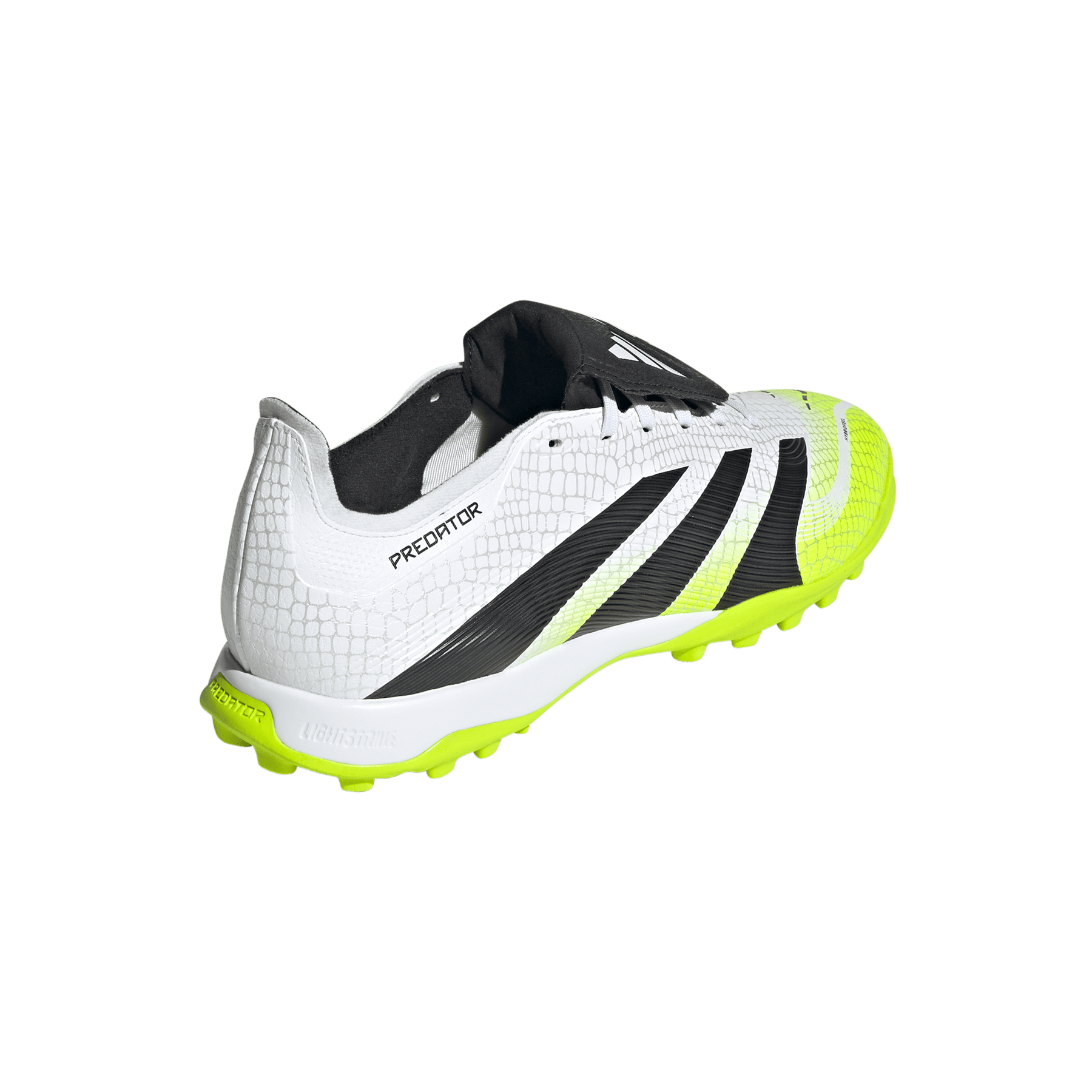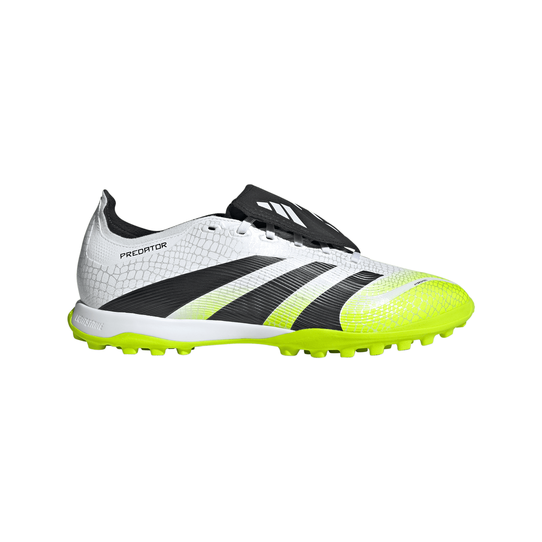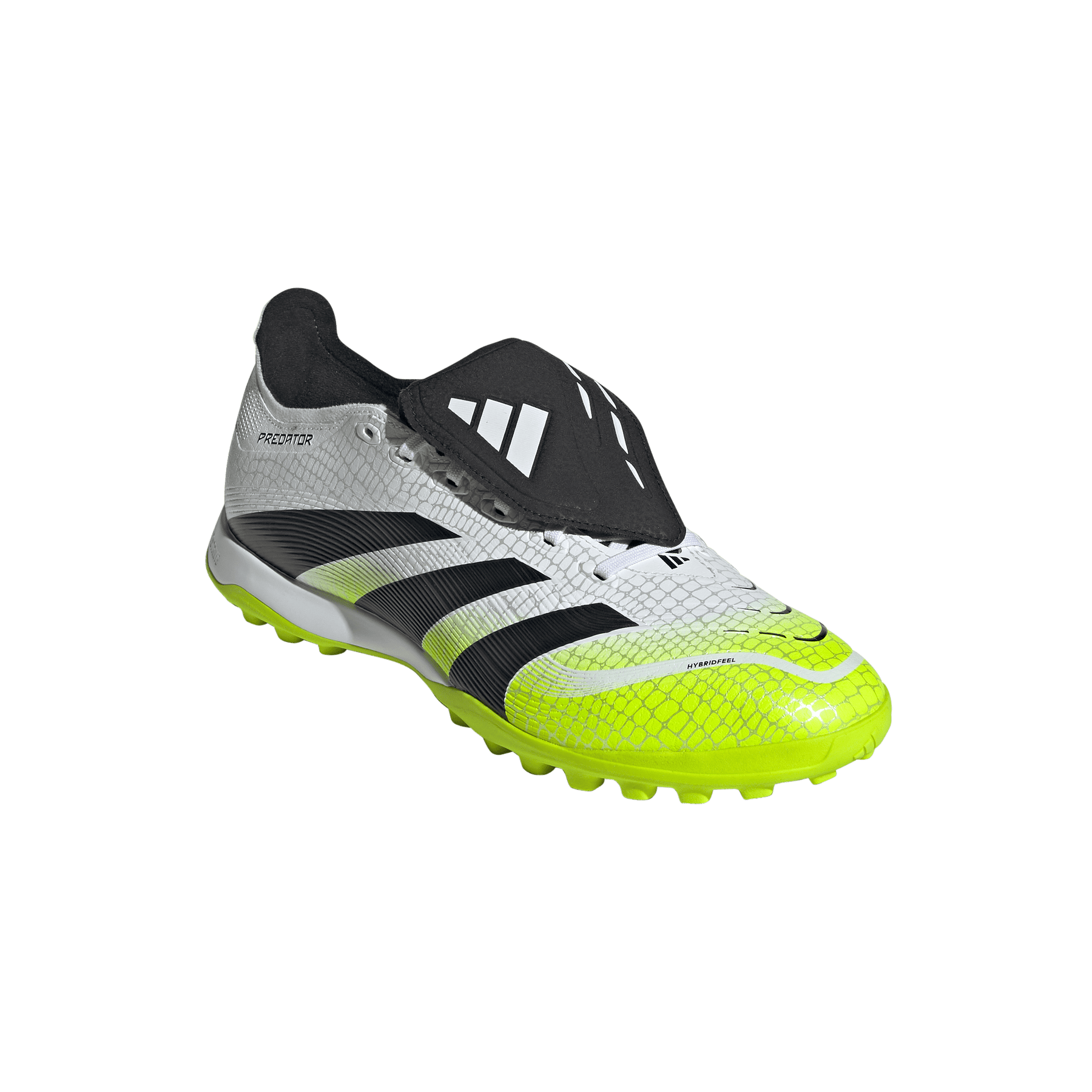 Discover the difference between aiming to score and knowing you will with adidas Predator boots that are crafted for goals. These League boots have a Hybridfeel upper that incorporates an all-over 3D texture, a fold-over tongue and grippy Strikescale fins to help you manipulate the football during strikes. A Lightstrike midsole and lug rubber outsole keep you comfortable and stable on artificial turf.