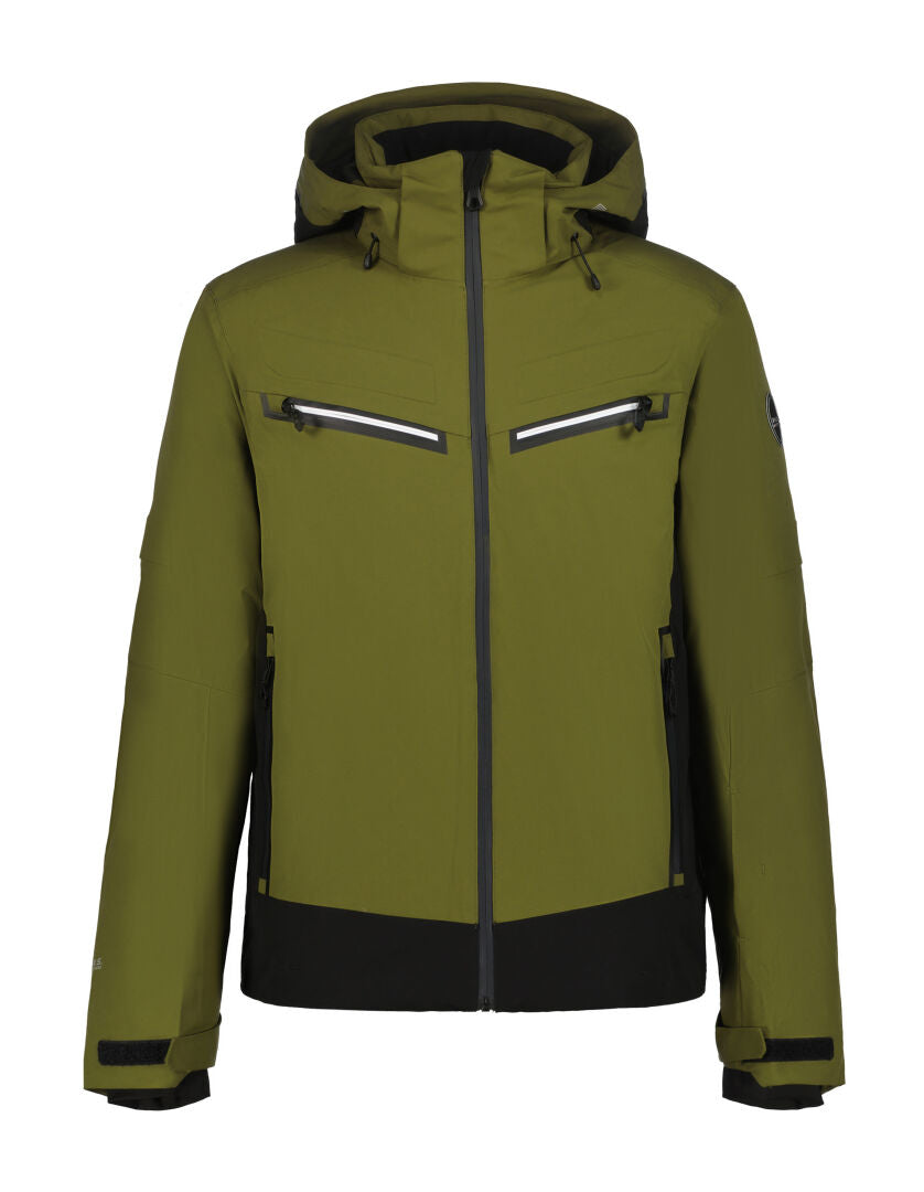 Icepeak wadded jacket for men. Articulated elbows. Comfortable inner collar. Two-way-adjustable hood. Detachable hood. Adjustable cuffs. Elastic inner cuffs with thumbholes. Two front pockets with water-repellent zips. Lined hand warming pockets. Two chest pockets with water-repellent zips. Large internal mesh pocket. Internal zip pocket. Ski pass pocket on the sleeve. Water-repellent front zip. Wind placket. Chin guard on the front zip. Adjustable hem. Fixed snow gaiter. Snow gaiter with anti-slip silicone band. 3D details. Water column 15 000 mm. Breathability 10 000 g\m2\24h. This A.W.S. EXTREME product meets the needs of active outdoor people even in extreme conditions. Structural details and protective materials make the product functional in every weather. The 4-way stretch material stretches in all directions giving maximum freedom of movement. All seams have been taped to make the product perfectly waterproof. Made of a 2-layer fabric, in which a waterproof membrane is bonded to a multifunctional material. The fabric surface has been treated with a water-repellent finish. Extra ventilation in areas where perspiration is highest to maximise breathability and comfort. This windproof material provides optimal wind protection and warmth. Warm insulation.
