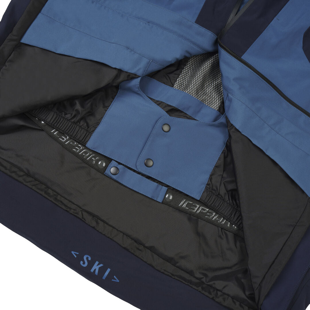 Storage is arranged for winter use. A large front pocket carries gloves or layers, a vertical breast pocket keeps documents or a phone accessible, and a dedicated ski pass pocket makes lift access straightforward. The anorak has a regular fit that balances room for mid layers with a neat profile under a harness or pack.