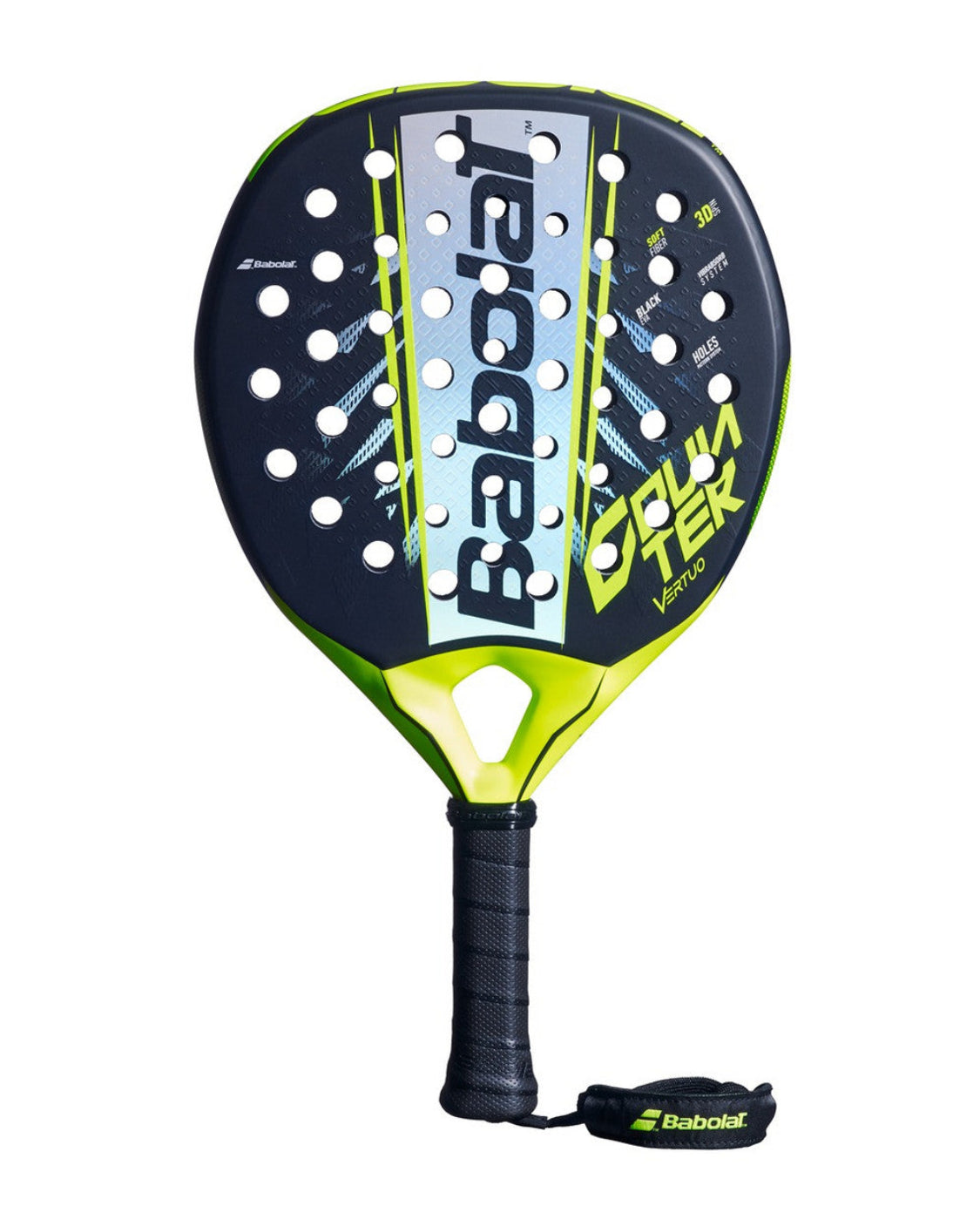 The Babolat Counter Vertuo is designed for players who value precision and comfort without sacrificing performance. The fiberglass composition offers a mix of power and comfort, ideal for those who want a more accessible and manageable playing experience, especially in defensive and counter-striking contexts.The round design and large sweet spot facilitate control and precision with every shot, allowing for greater consistency in ball impacts. This racquet is equipped with the Holes Pattern System and Vibrabsorb System technology, which helps reduce vibrations and provides greater comfort, minimizing the risk of arm injuries and improving the feeling of control.In summary, the Counter Vertuo is the ideal choice for players who prioritize precision and comfort, maintaining excellent performance both in defense and attack modes.The professional players on the Babolat Team may play with a customized or a different model of the existing equipment.Click here for instructions.