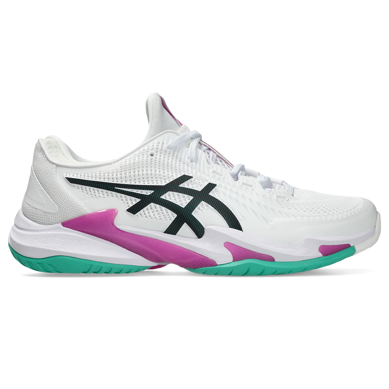 The Asics Court FF 3 delivers a speedy feel, glove-like support, and the stability to withstand the most aggressive movements. Designed for one of the most agile players the game has ever seen Novak Djokovic, this update increases the outsole's contact area creating a stable landing and reduces the load exerted on the body. The upper hugs the foot like a glove thanks to the mono-sock bootie construction, and is more breathable than before due to a more open mesh under the laces. FlyteFoam under foot feels very responsive and cuts down on weight, while the signature GEL technology absorbs harsh court shock.