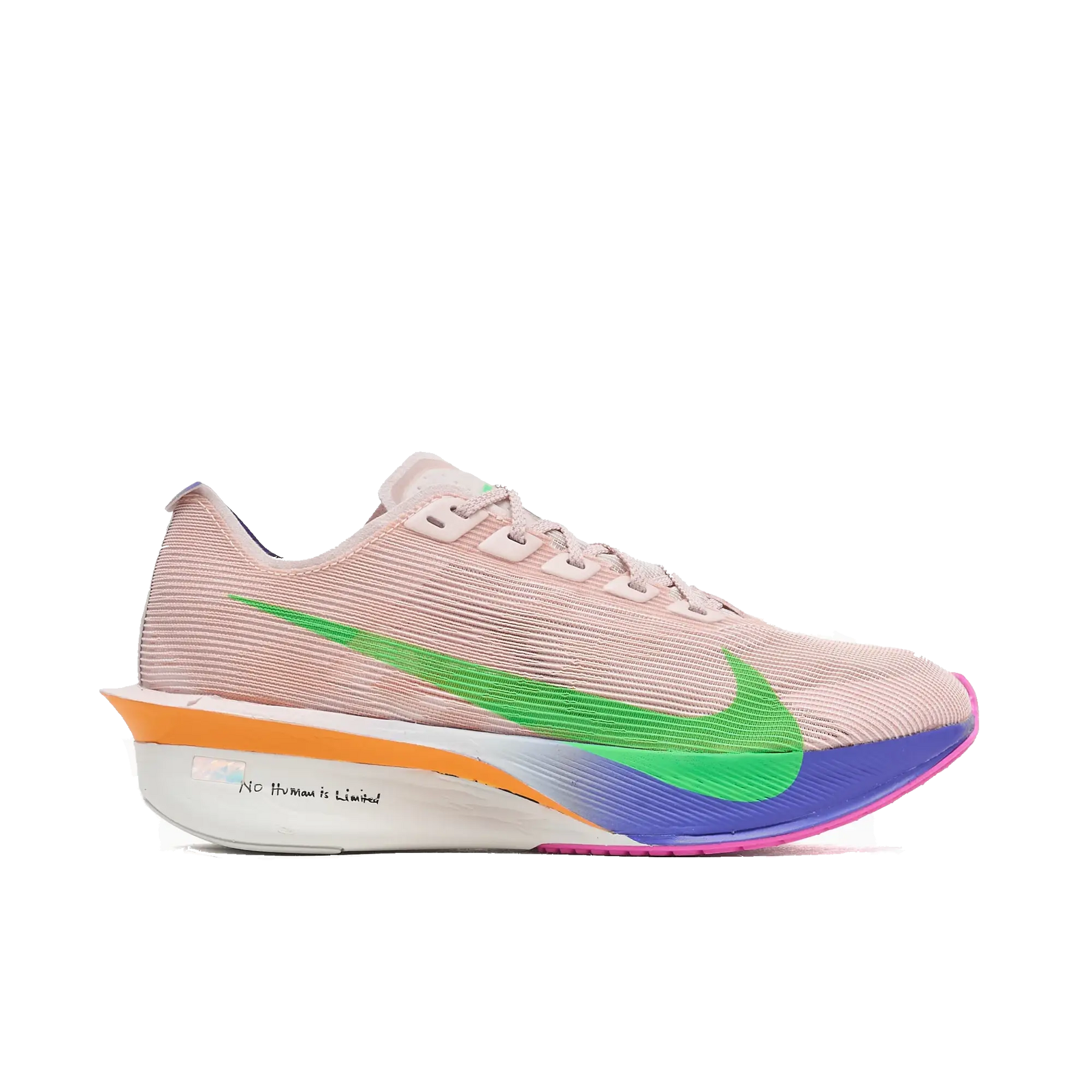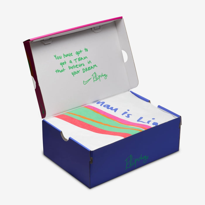 Eliud Kipchoge says achieving your dream isn't a solo endeavour, so we utilised his community in designing this shoe. His family influenced the colour selection and the multi-style Swoosh logo, which represents the strength behind a team. "No human is limited" nods to the endless possibilities you have with a support system.