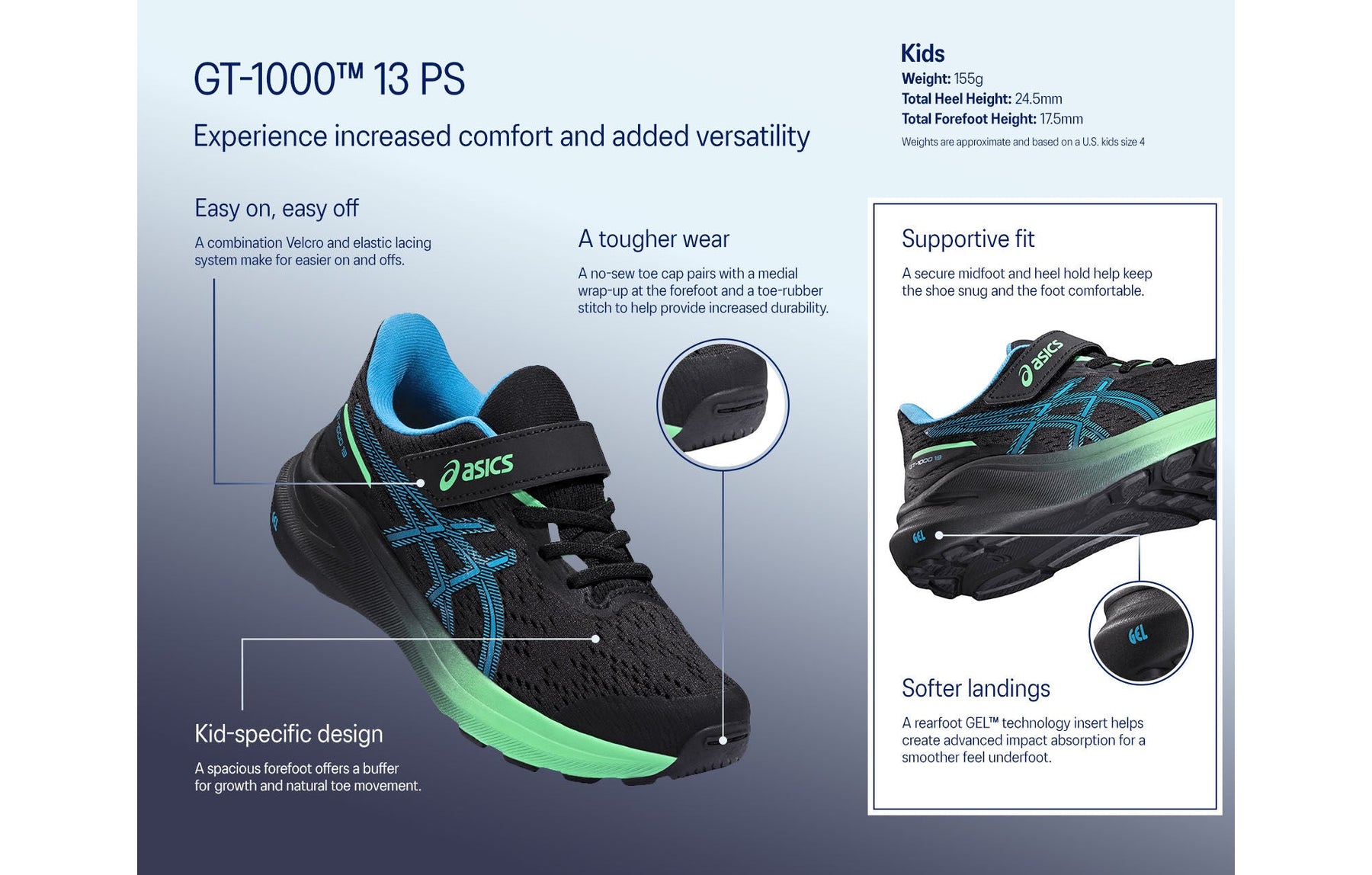 The GT-1000™ 13 PS (Pre-School) shoe is a versatile stability trainer that's functional for various distances. We've updated the underfoot cushioning to make it feel more comfortable and energetic.